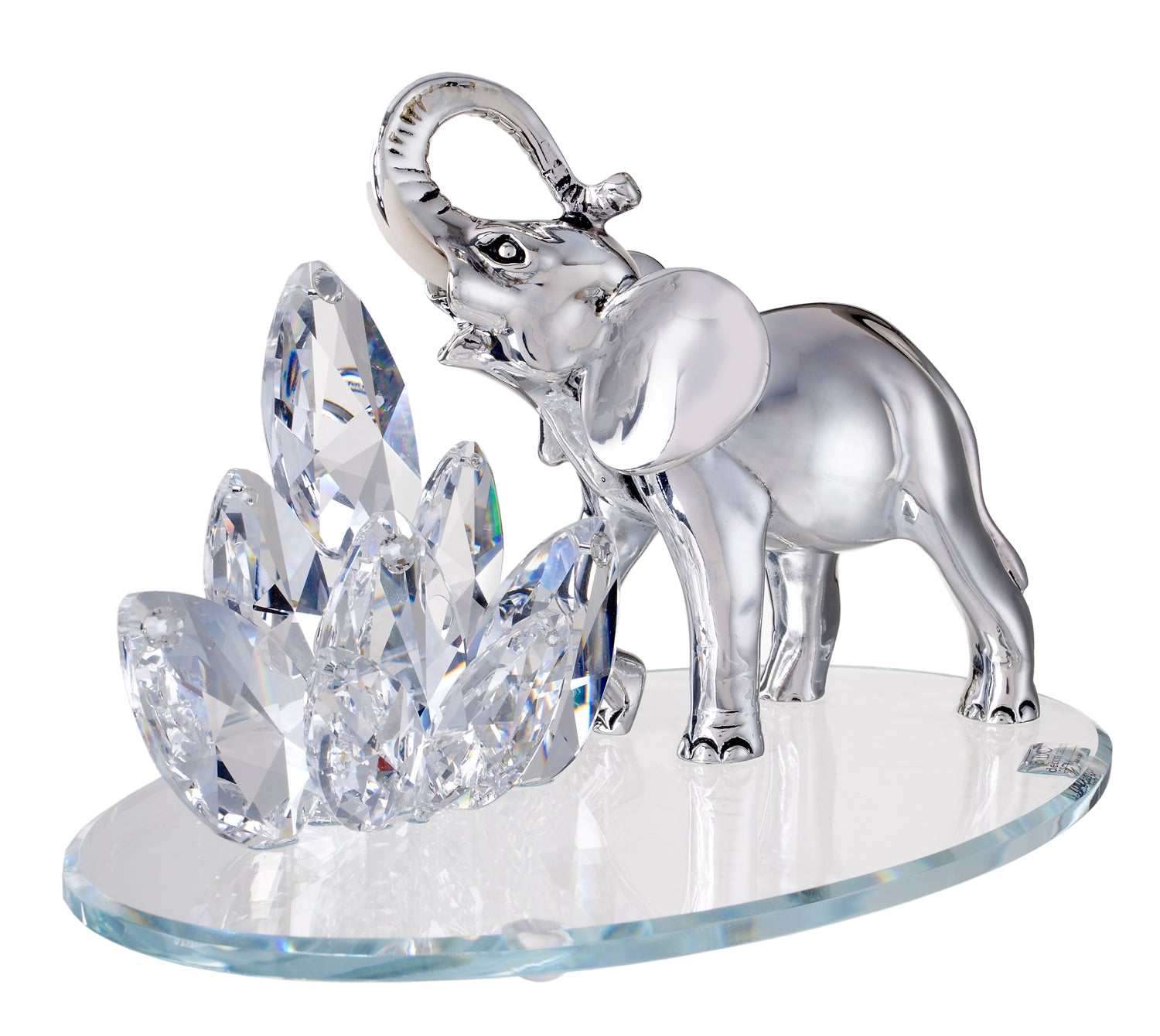 In this Debora Carlucci figurine, an elephant that is carved from authentic 925 silver bespeaks power with a thrust of its head, showcasing clean lines and attention to detail. The animal rests on a Swarovski crystal plat of glass, which is accented with crystal balls and flowers. It is the finishing touch that speaks volumes.