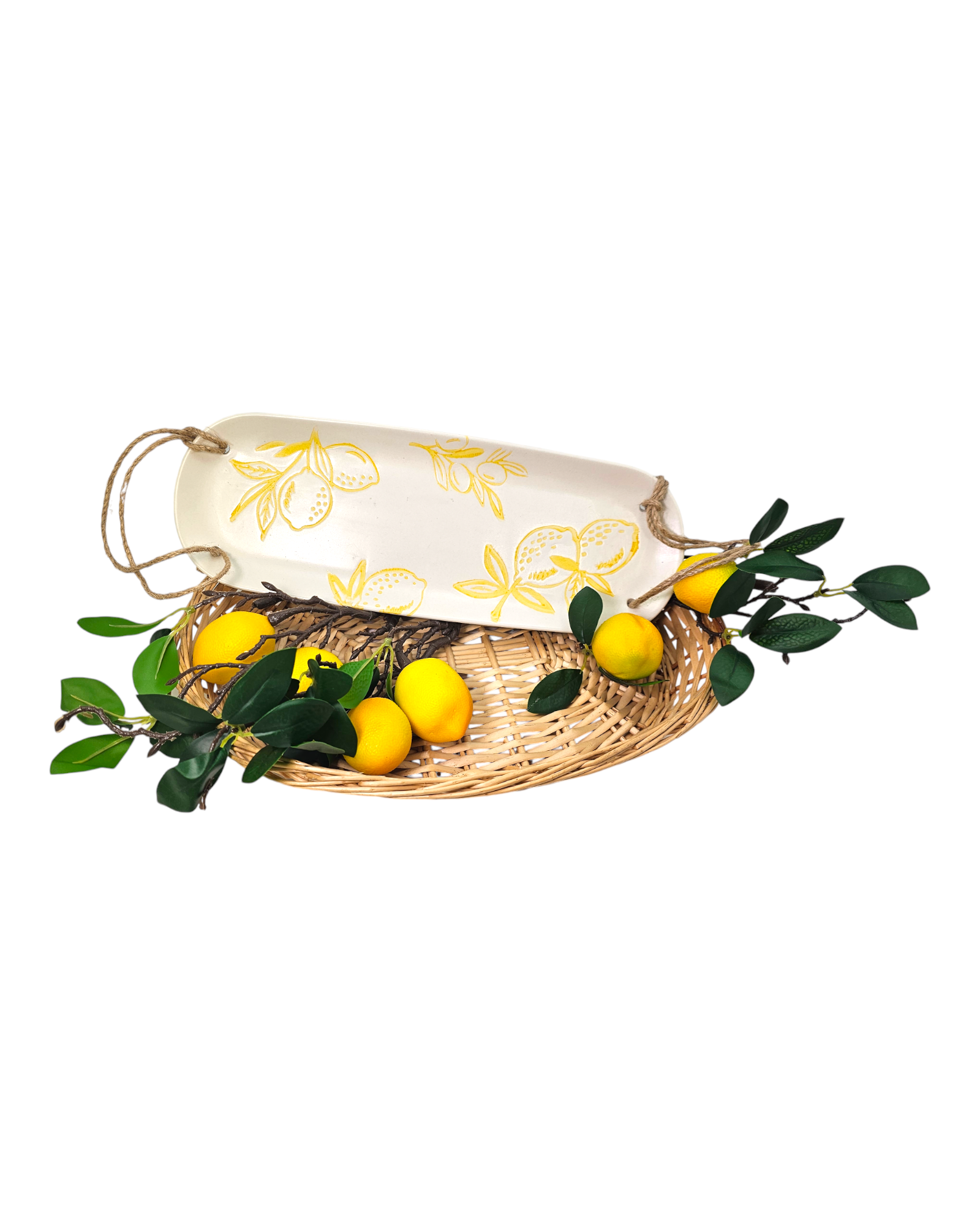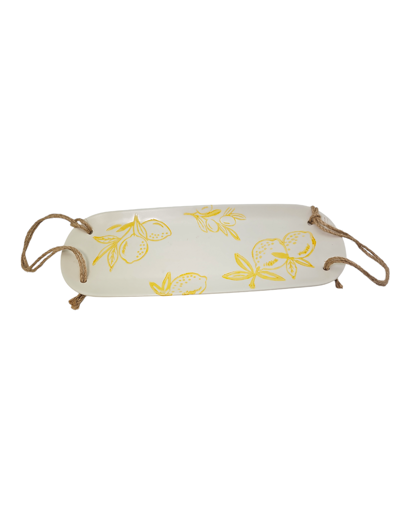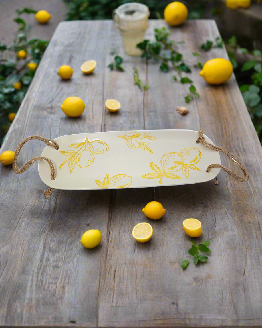 Enhance your dining experience with our Cucina Italiana Lemon Design Rectangular Serving Plate. Crafted with a beautiful lemon design, this 14" plate adds a touch of elegance to your table setting. The rope detailing adds a unique touch, making it a perfect addition to any kitchen.