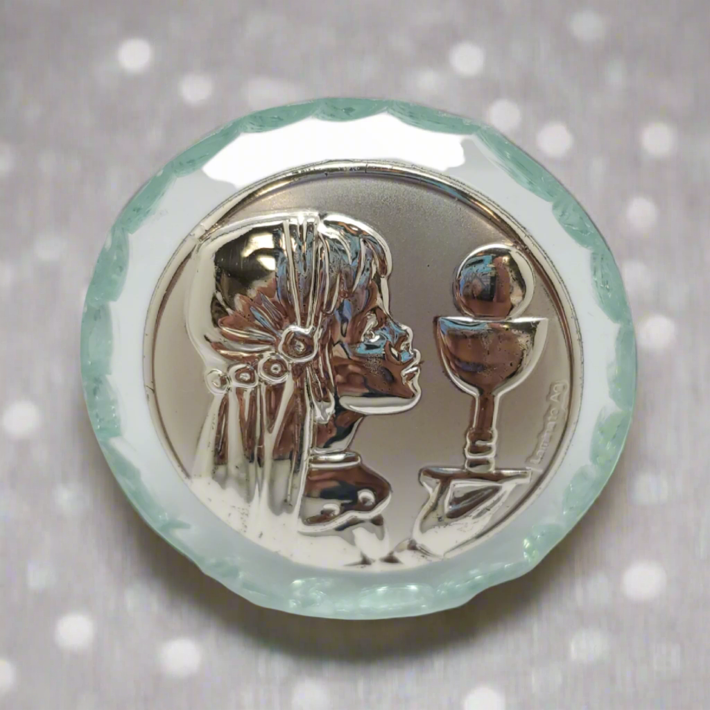 Muestre con orgullo esta placa de plata 925 que representa a una niña participando en su primera comunión en cualquier sala de estar formal. Deje que traiga una sensación de paz a una sala de estar formal o sea un gran favor o regalo de fiesta ceremonial.