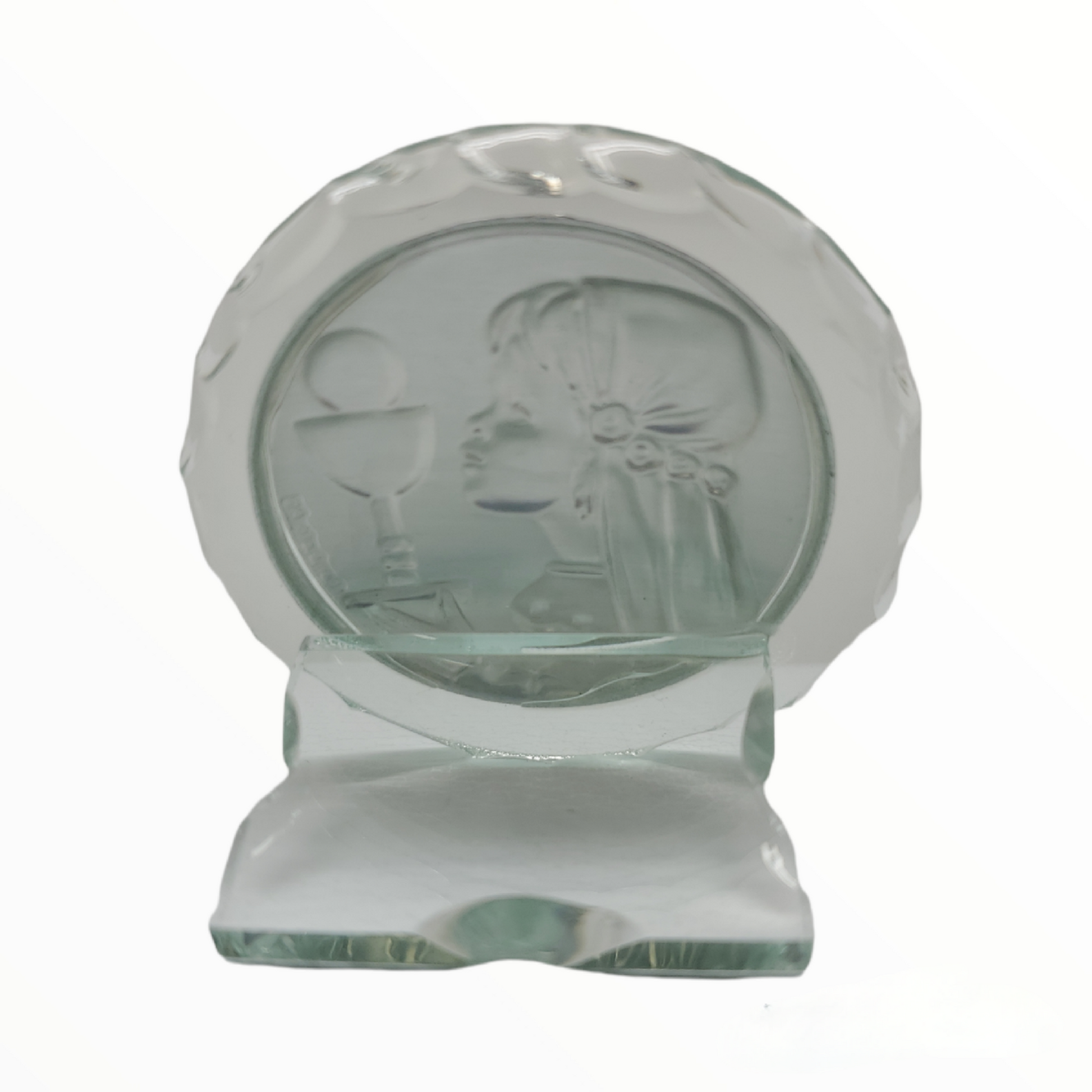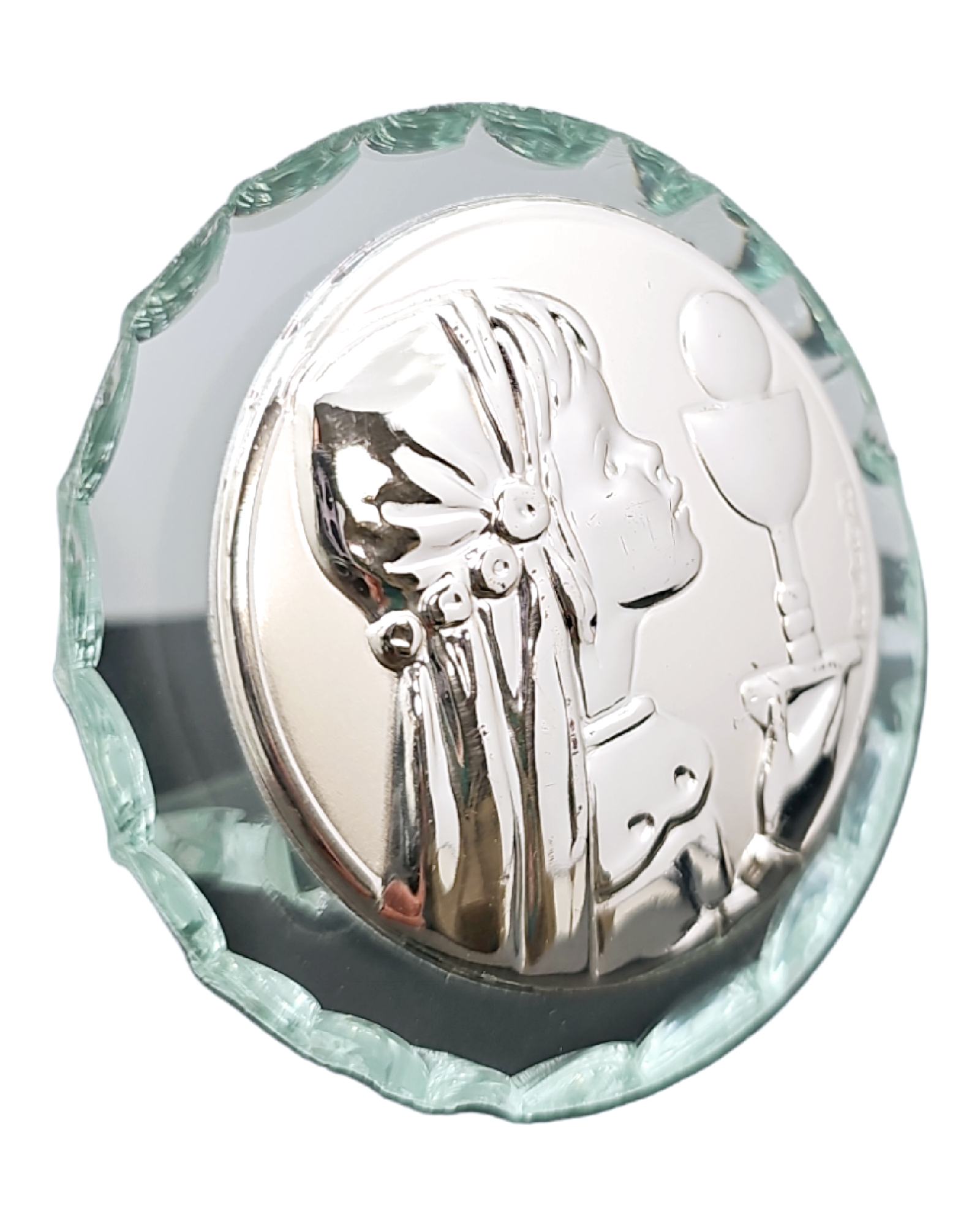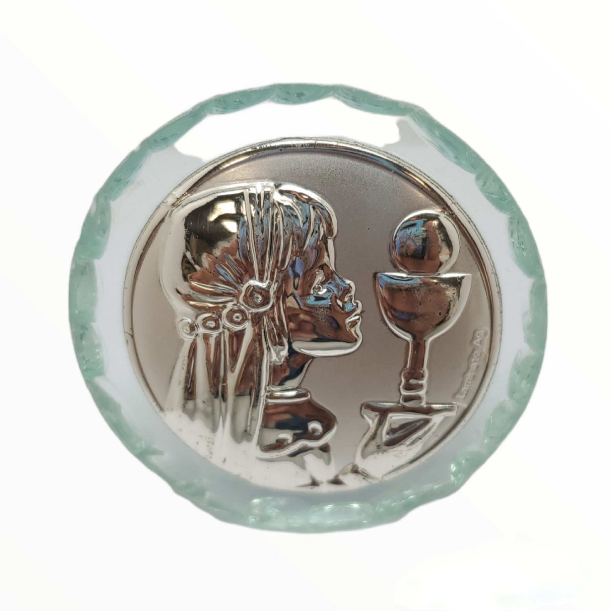 El diseño principal está elaborado en plata 925 y colocado dentro de una pantalla ovular elaborada en cristal. Esta pieza puede ser una pieza de exhibición como parte de una ceremonia de primera comunión o como una decoración de buen gusto en un lugar de culto. viene en una caja de favor con un Certificado de Origen y Autenticidad.
