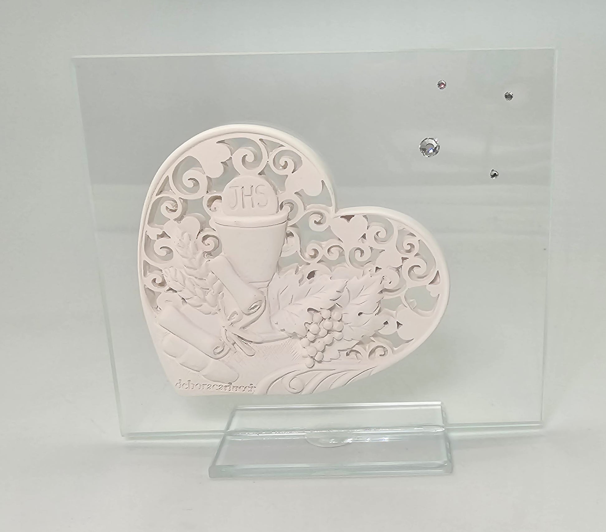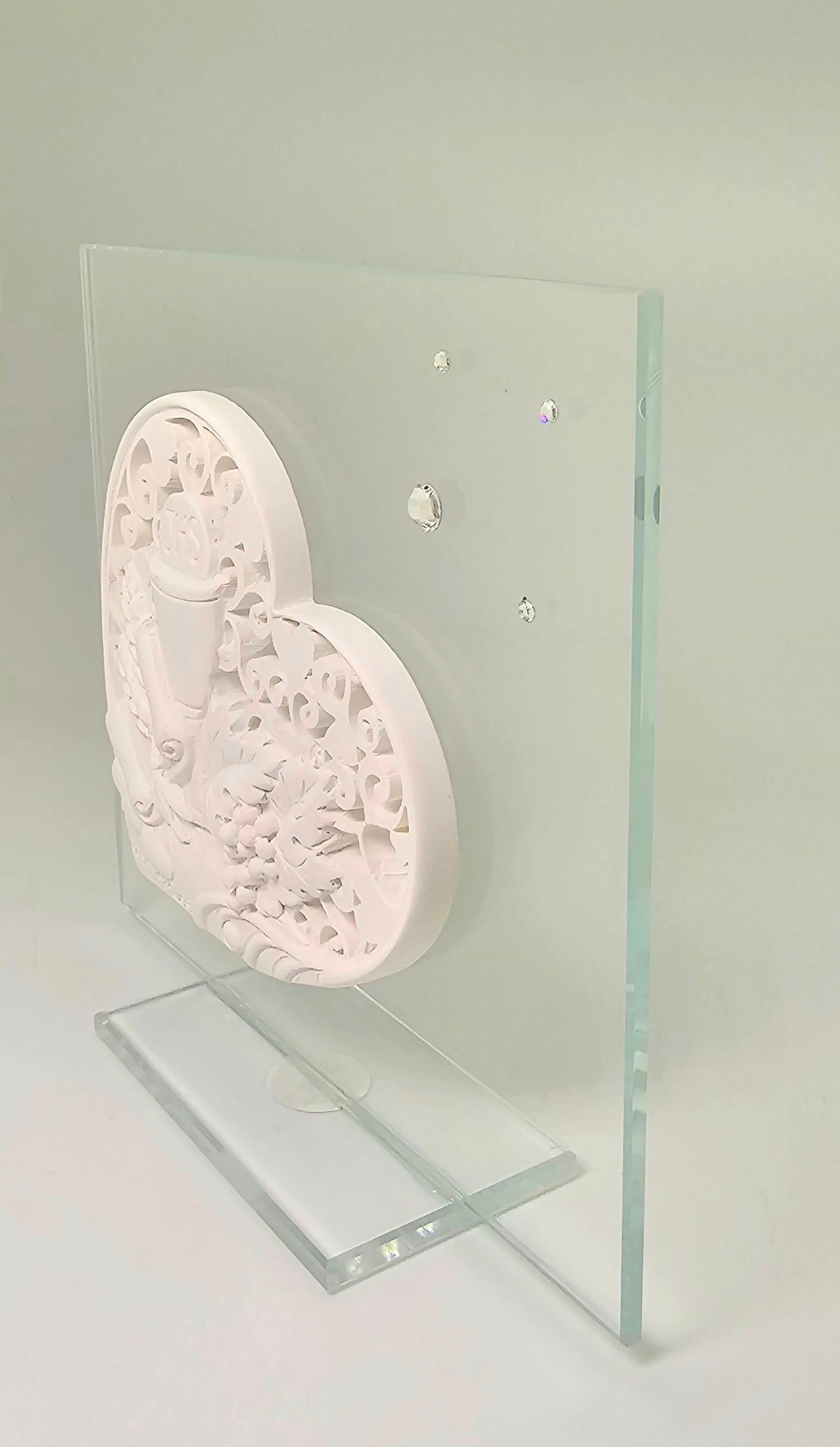 El diseño principal está elaborado en plata 925 y colocado dentro de una pantalla ovular elaborada en cristal. Esta pieza puede ser una pieza de exhibición como parte de una ceremonia de primera comunión o como una decoración de buen gusto en un lugar de culto. viene en una caja de favor con un Certificado de Origen y Autenticidad.