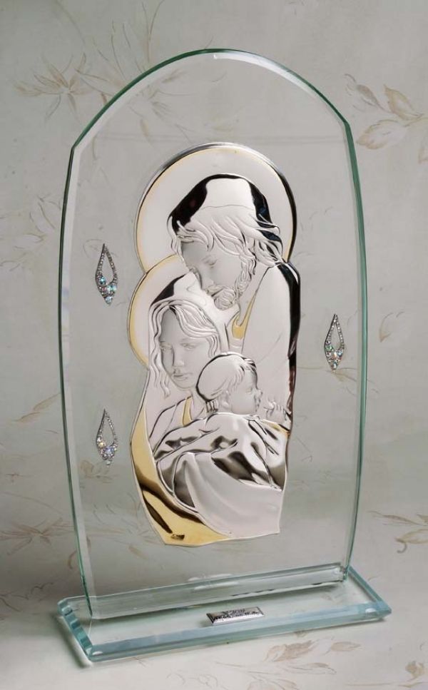 Sagrada Familia Plata Argento 925 Italiana c. Detalles enchapados en oro de 18 kt sobre base de vidrio grueso #18978