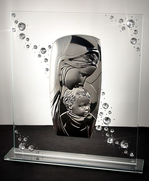 Madonna italiana de plata 925 c. Icono de niño w. Lluvia de cristales Swarovski en base de vidrio #20941
