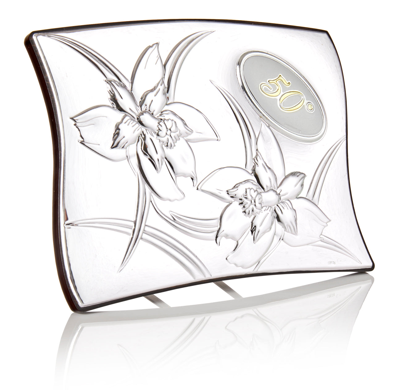 Placa 50 Aniversario 925 Argento con respaldo de madera por Panorama Italia. 50 Aniversario 925 Placa Argento con respaldo de madera por Panorama Italia. Honre a la feliz pareja con un aniversario de bodas de plata dorada italiana 925 en una placa de respaldo de madera. Un recuerdo personal atesorado y duradero para bodas o aniversarios.