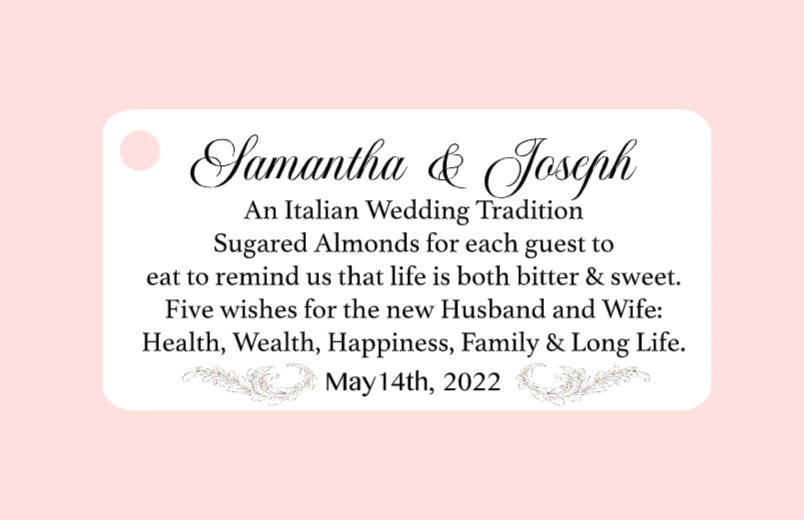 Adjuntar una etiqueta personalizada, (Bigliettini) resaltará su atención a los detalles y traerá un encanto personalizado a su boda, su recepción y sus artículos de ceremonia. Transforme artículos ordinarios en recuerdos extraordinarios y obsequios bien pensados simplemente colocando una etiqueta con una bonita cinta, cordel, filamento dorado o rafia. Vea lo fácil que puede ser agregar un toque personalizado cuando crea una etiqueta de recuerdo de boda personalizada. Compre nuestra increíble selección de etiquetas de recuerdo de boda, comuniones, despedidas de soltera o simplemente un simple agradecimiento, y cree algo espléndido con la ayuda de nuestra boda. boutique e ideas de etiquetas a favor.