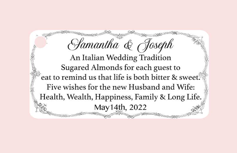 Adjuntar una etiqueta personalizada, (Bigliettini) resaltará su atención a los detalles y traerá un encanto personalizado a su boda, su recepción y sus artículos de ceremonia. Transforme artículos ordinarios en recuerdos extraordinarios y obsequios bien pensados simplemente colocando una etiqueta con una bonita cinta, cordel, filamento dorado o rafia. Vea lo fácil que puede ser agregar un toque personalizado cuando crea una etiqueta de recuerdo de boda personalizada. Compre nuestra increíble selección de etiquetas de recuerdo de boda, comuniones, despedidas de soltera o simplemente un simple agradecimiento, y cree algo espléndido con la ayuda de nuestra boda. boutique e ideas de etiquetas a favor.
