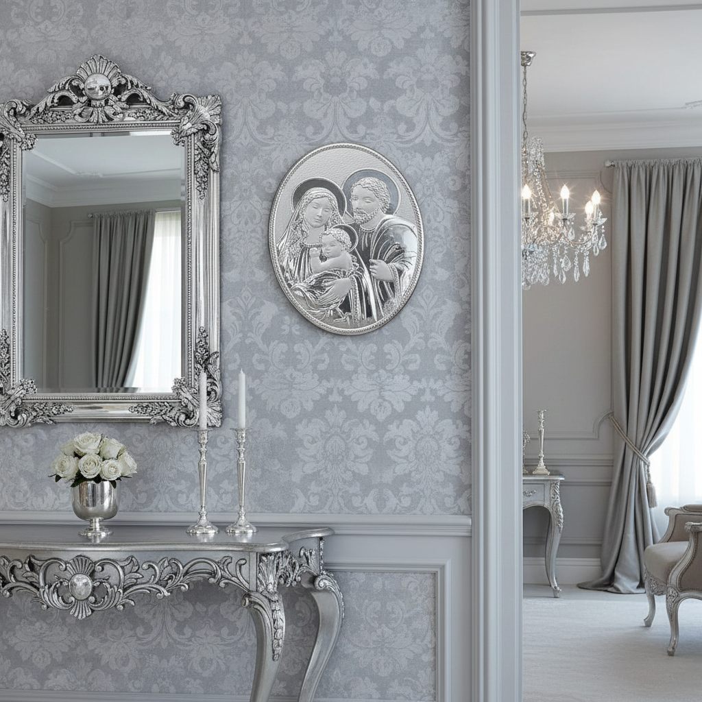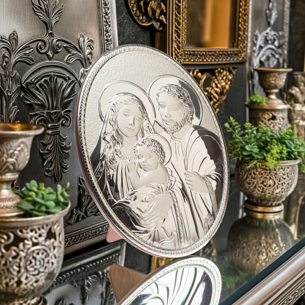 Sacra Famiglia Italiana 925 Argento Argento Targa Religiosa Ovale 13 x 18 #1997