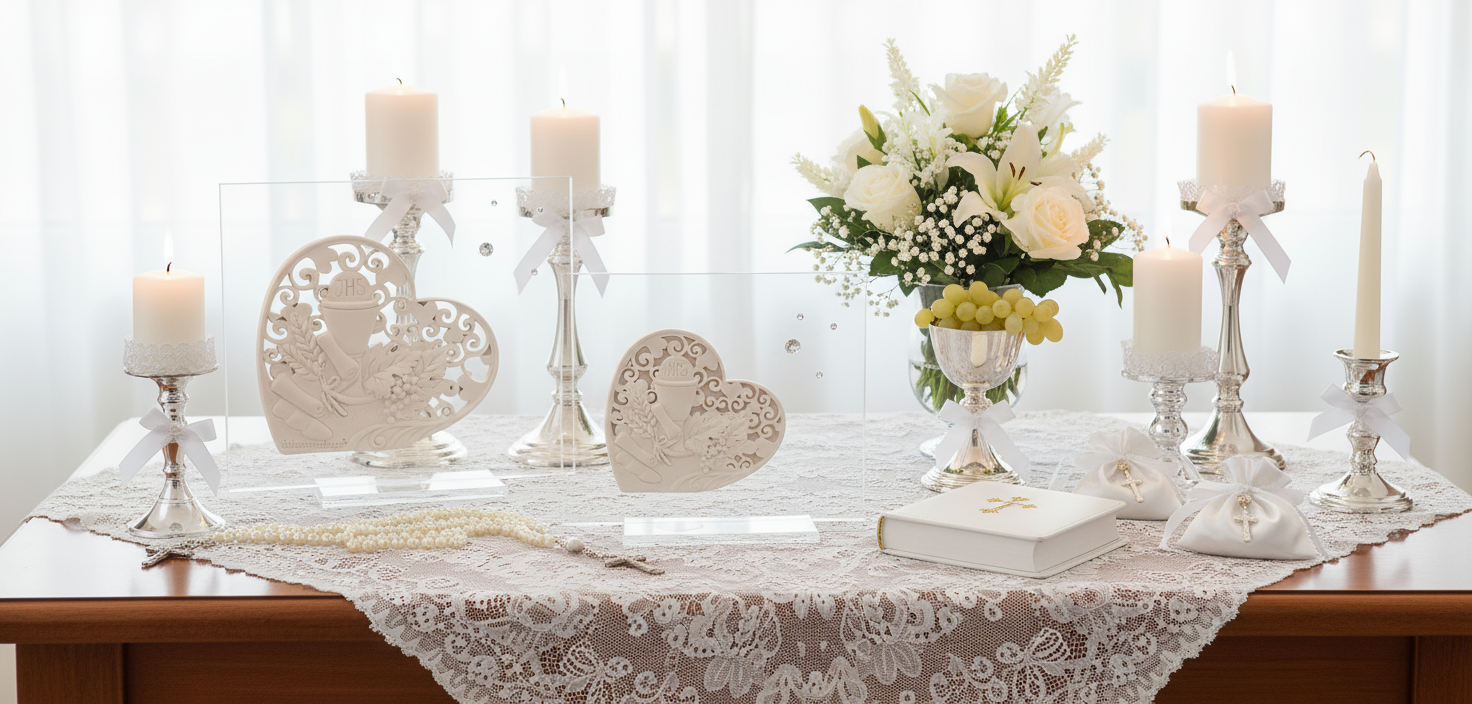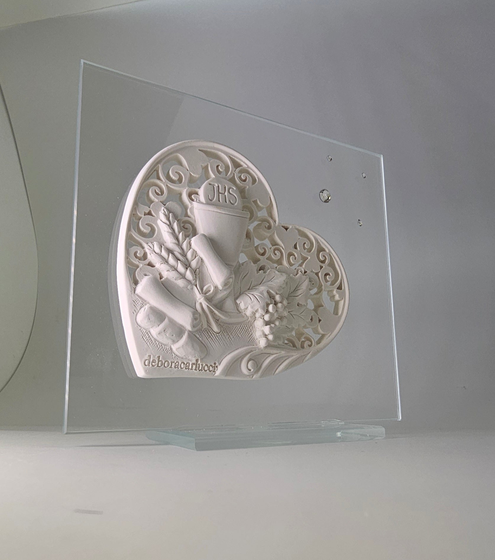 Il design principale è realizzato in argento 925 e collocato all'interno di un display ovale realizzato in cristallo. Questo pezzo può essere un pezzo da esposizione come parte di una cerimonia della prima comunione o come decorazione di buon gusto in un luogo di culto. viene fornito in una scatola di favore con un certificato di origine e autenticità.