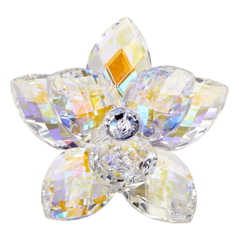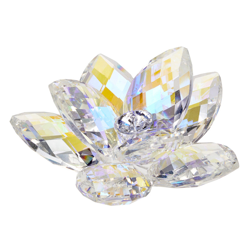 Questa statuina di fiore di loto brilla in cristallo trasparente con un bocciolo centrale di Murano. Ideale per bomboniere, bomboniere per anniversari, dolci 16 bomboniere o bomboniere per compleanni.