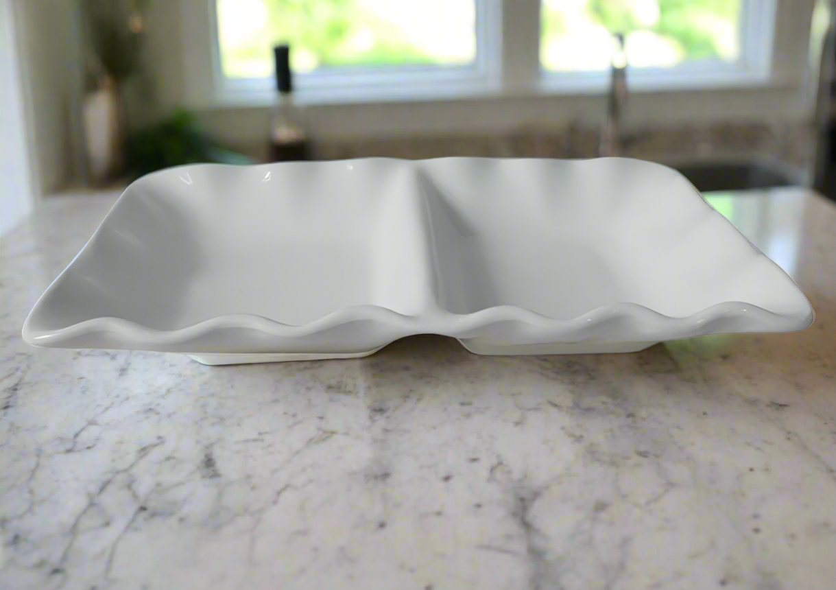 Separa diverse salse, dessert, antipasti e altro ancora in un vassoio con il piatto per salse in porcellana dolomite a 2 scomparti The Original Cucina Italiana Collection. Realizzato in fine porcellana, questo piatto mette in mostra il tuo gusto caratteristico, guacamole, salsa, pesto, salsa e altro ancora. Inoltre, il colore brillante e vibrante fa risaltare il tuo cibo! Grazie alla sua forma lunga, stretta e rettangolare, questo piatto salvaspazio è perfetto da posizionare al centro di una tavola per la condivisione. Ogni scomparto include lati invertiti, ottimo per aiutare i clienti a raccogliere condimenti per patatine fritte o bastoncini di mozzarella. La sua forma è ideale anche per allineare più piatti quadrati o rettangolari sulla tua linea buffet. Usa gli scomparti poco profondi di questo piatto per assaggi di dessert, antipasti, cubetti di formaggio, frutta e verdura. È un ottimo modo per servire con eleganza il cibo del tuo ristorante, hotel o attività di catering! Grande bomboniera o idea regalo. crea una bellissima decorazione per feste o decorazioni per la casa. Lavabile in lavastoviglie. Per una maggiore durata del prodotto, non lavare questa tazza in una griglia piatta commerciale poiché più tazze di salsa potrebbero spostarsi e urtarsi l'una contro l'altra durante il ciclo di lavaggio.