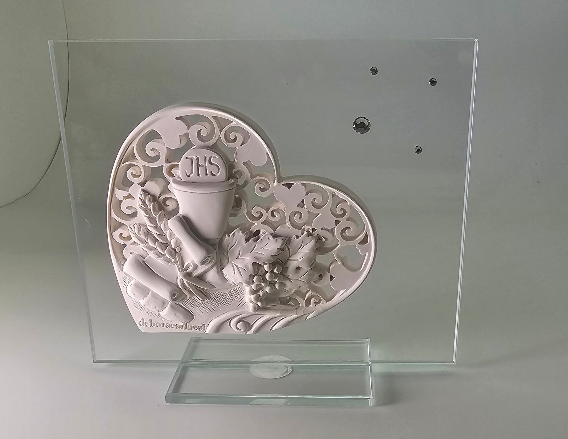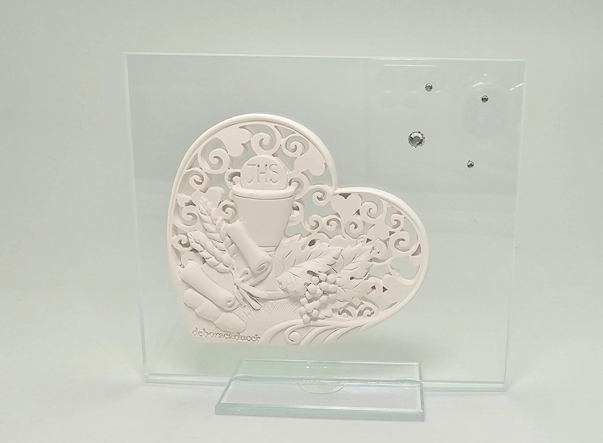 This elegant Italian Communion Chalice is crafted by the renowned Debora Carlucci. The design features a unique combination of luxurious crystal accents, Ivory Resin, and a timeless glass base. Perfect for traditional churches and chapels, this stunning piece is sure to be a treasured part of your spiritual service.